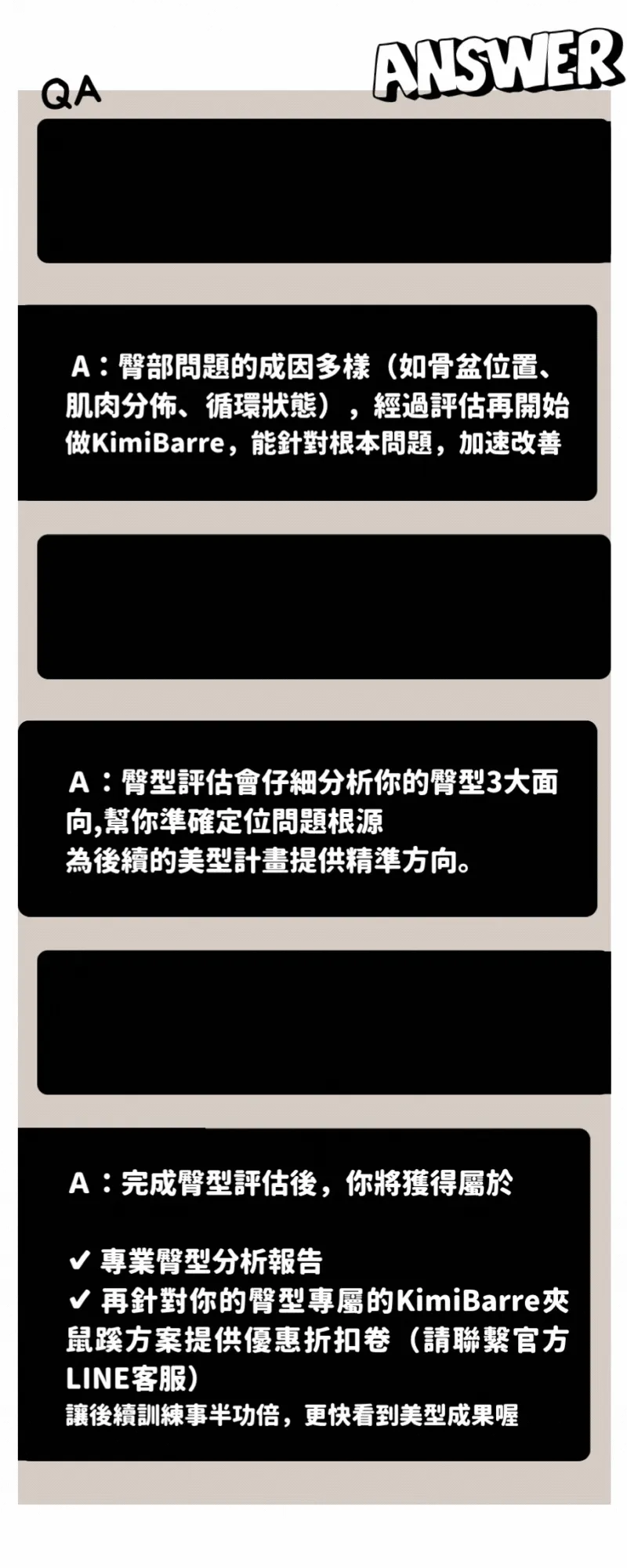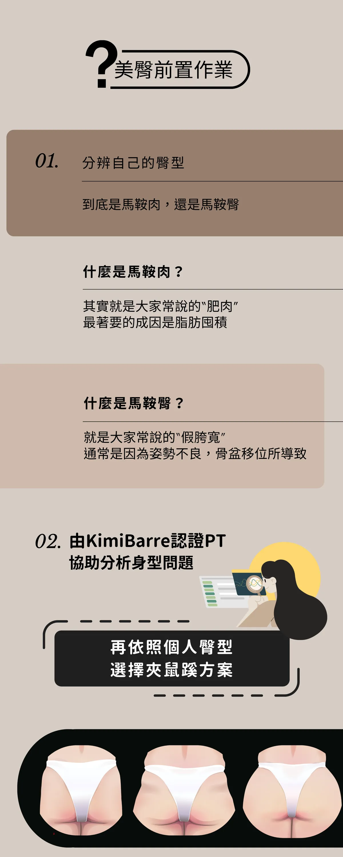 由 KimiBarre 認證第一級 PT 進行身型評估,全面檢視下身體態,精準分析臀型問題: