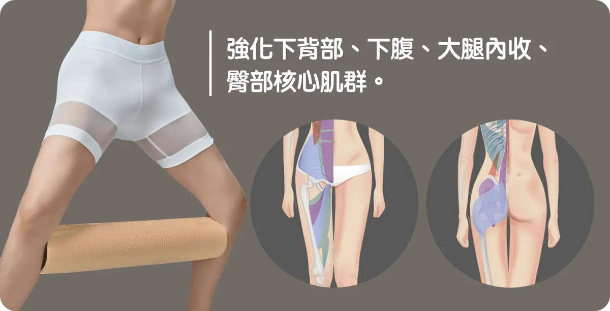 美型運動獨門夾鼠蹊動作透過專利輔具以獨特夾式訓練機制、從根本重建身體發力慣性,改善不良體態;進而強化下背部、下腹、大腿內收、臀部核心肌群